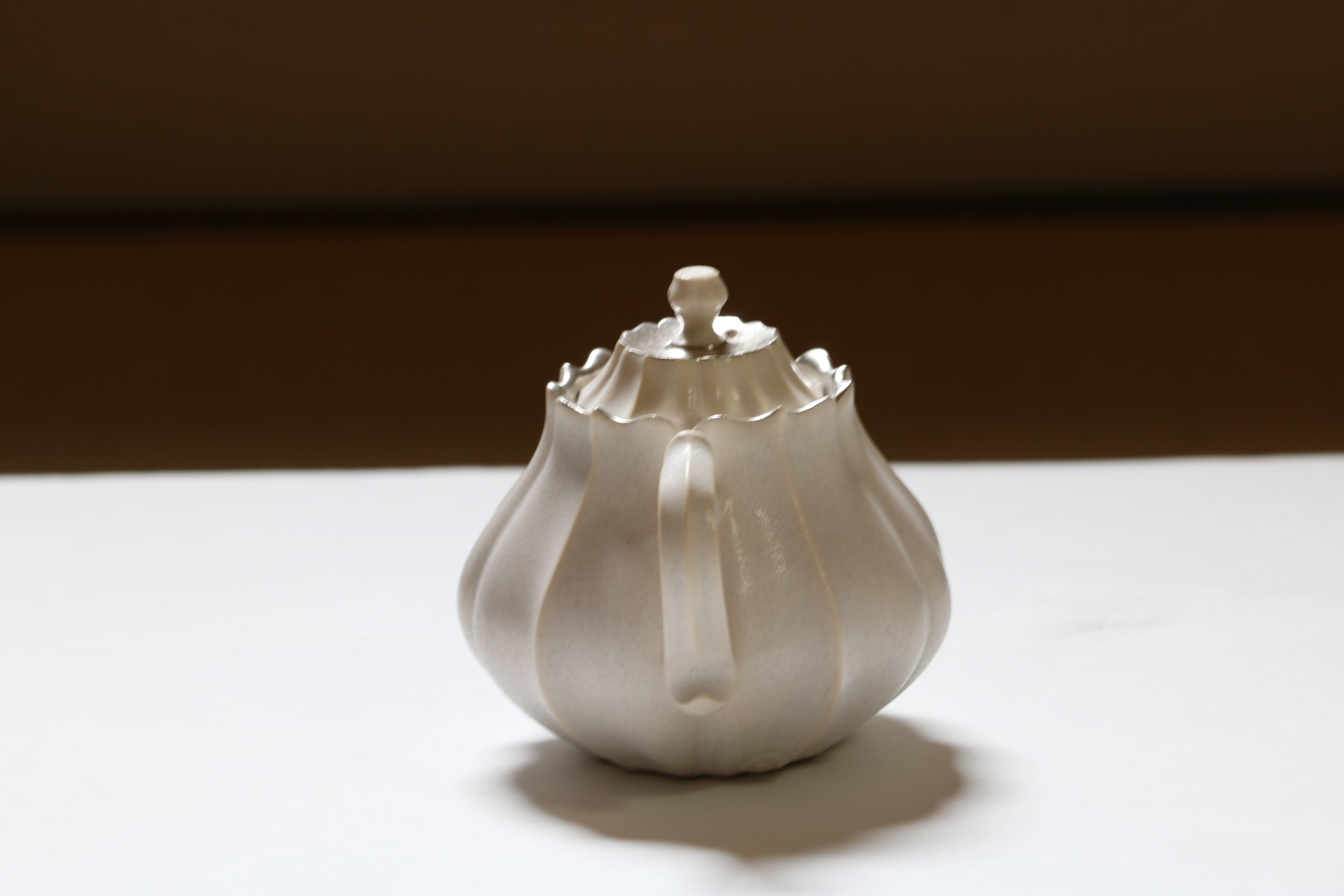 すずらんの花をモチーフにした美しい茶壺で、手のひらに心地よく馴染むマットな質感が魅力的です。品のある銀彩がアクセントとなり、落ち着いた雰囲気を演出します。